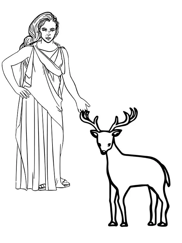 Beschreibung der Färbung : Druckbar herunterladen Griechische Göttin der Jagd mit einem niedlichen Hirsch Malvorlage
