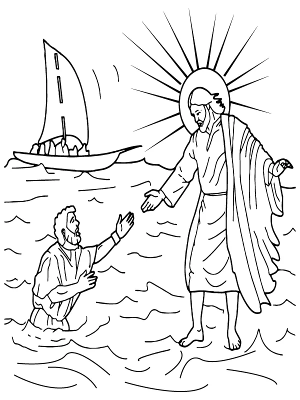Beschreibung der Färbung : Druckbar herunterladen Jesus geht auf dem Wasser und hilft Petrus Malvorlage