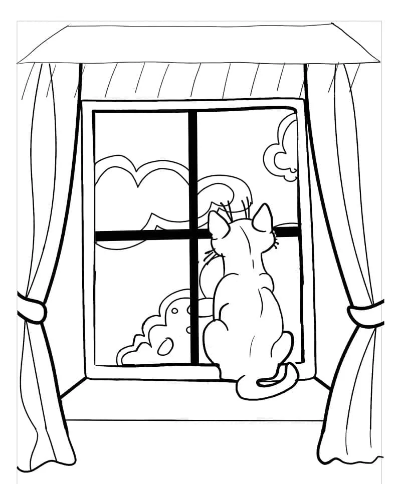 Klicken Sie auf die Schaltfläche Katze sitzt am Fenster Malvorlagen, um die Druckversion anzuzeigen oder online auszumalen (kompatibel mit iPad und Android-Tablets).