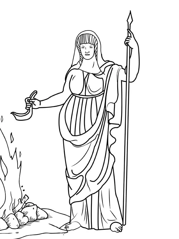 : Druckbar herunterladen Hestia mit Speer und Feuerstelle Malvorlage