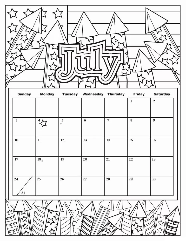 : Druckbar herunterladen Juli 2019 Kalender Malvorlage