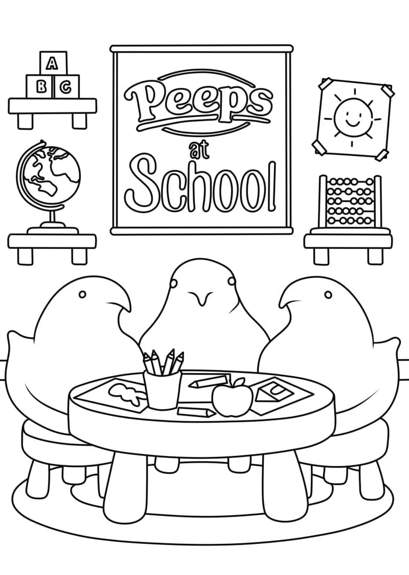 : Druckbar herunterladen Peeps in der Schule Malvorlage