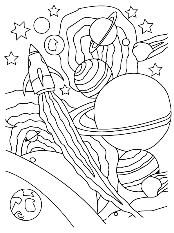 : Druckbar herunterladen Künstlerischer Weltraum mit Rakete Malvorlage