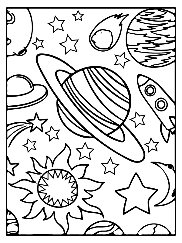 : Druckbar herunterladen Saturn und Raketen Malvorlage