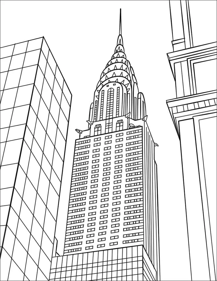 Klicken Sie auf die Schaltfläche Chrysler Gebäude Malvorlagen, um die Druckversion anzuzeigen oder online auszumalen (kompatibel mit iPad und Android-Tablets).