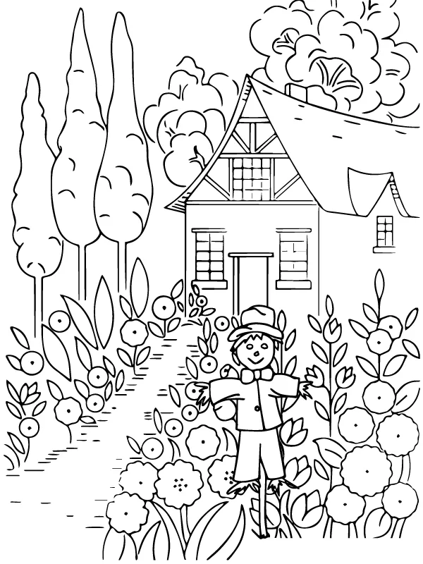 : Druckbar herunterladen Glückliche Vogelscheuche Malvorlage