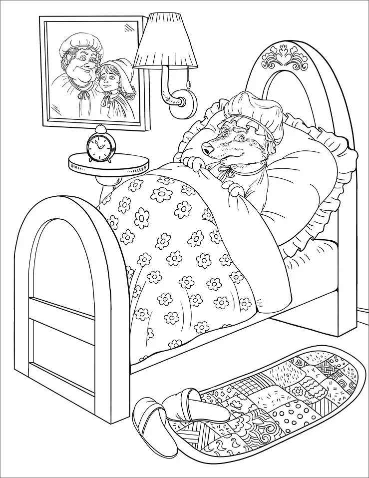 : Druckbar herunterladen Wolf Gets into Grandmother’s Bed Malvorlage