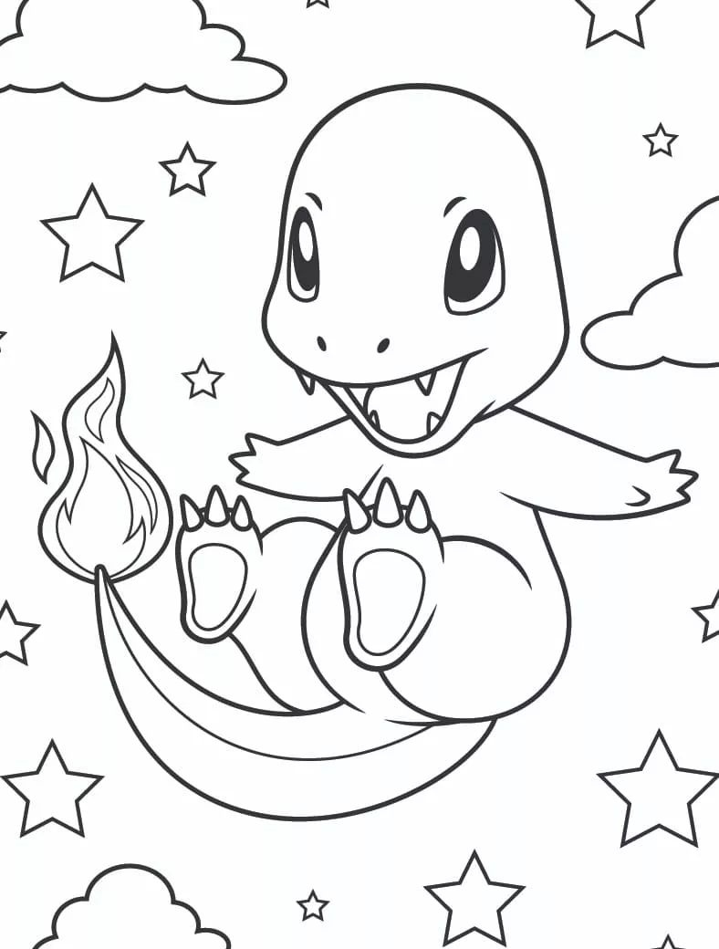 Coloring description : Download Printable Charmander and Stars Coloring Page