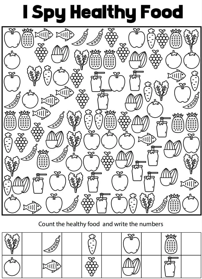 Coloring description : Download Printable I Spy Healthy Food Coloring Page