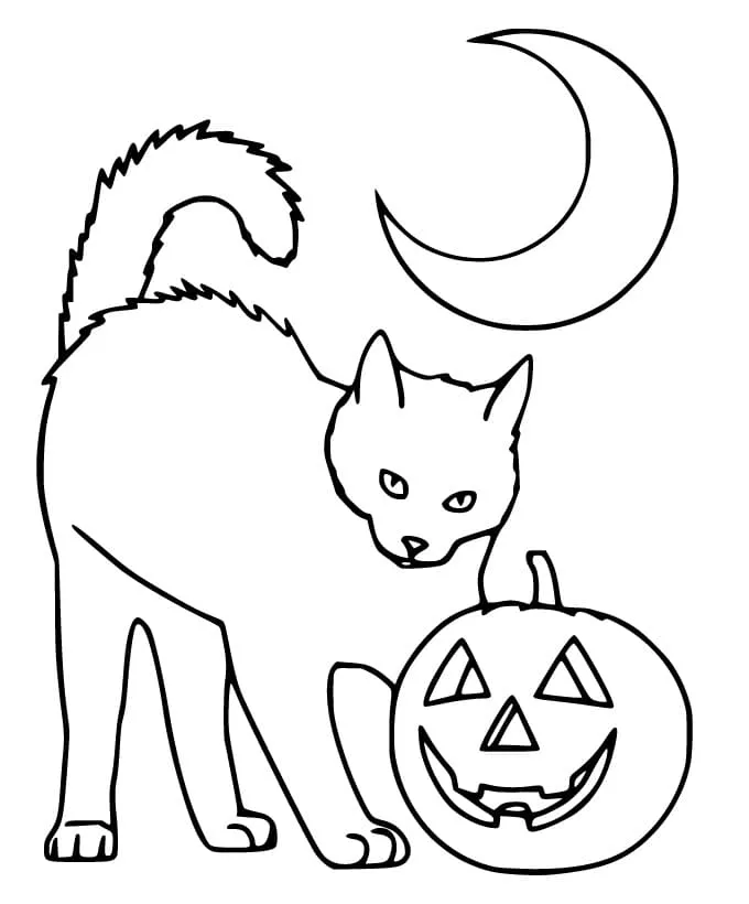 Coloring description : Download Printable Cat, Pumpkin and Moon Coloring Page