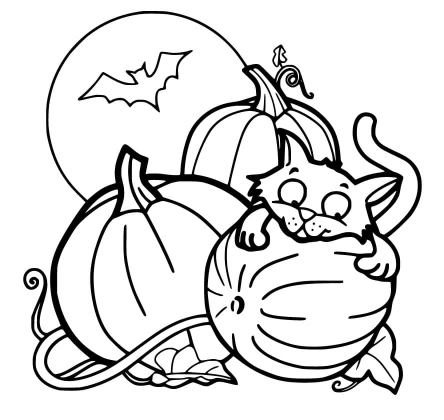 Coloring description : Download Printable Little Cat and Pumpkins Coloring Page