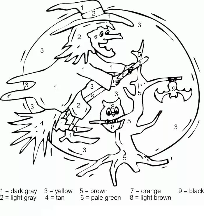 Coloring description : Download Printable Halloween Witch Flying Color by Number Coloring Page