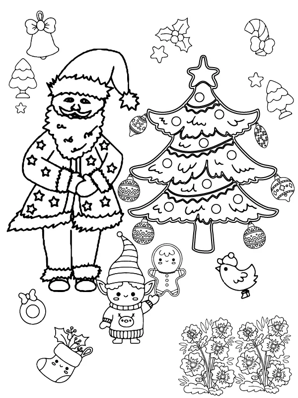 Coloring description : Download Printable Simple Christmas Tree and Santa Themed Coloring Page