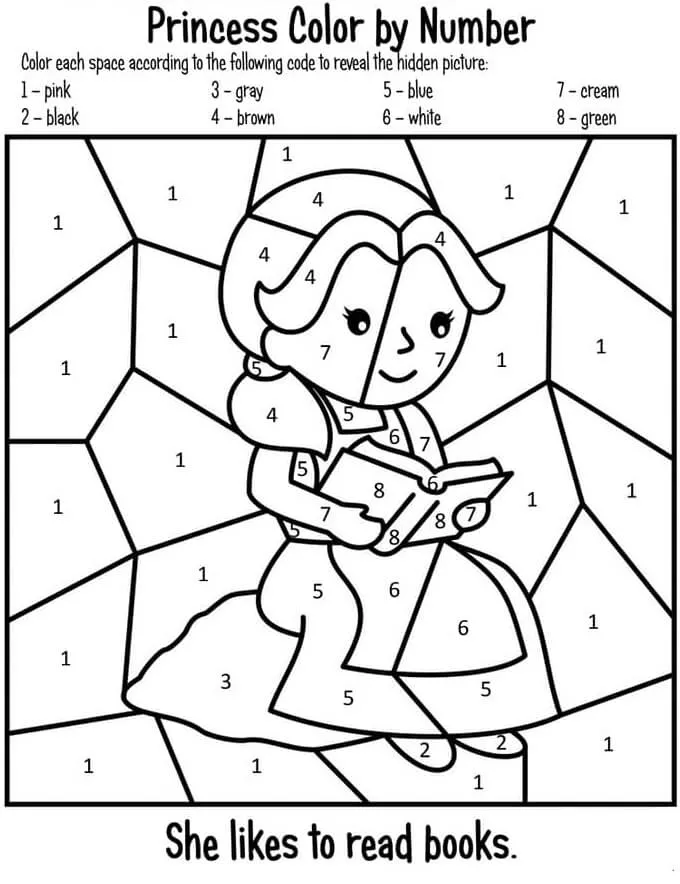 Coloring description : Download Printable Princess Reading Book Color by Number Coloring Page