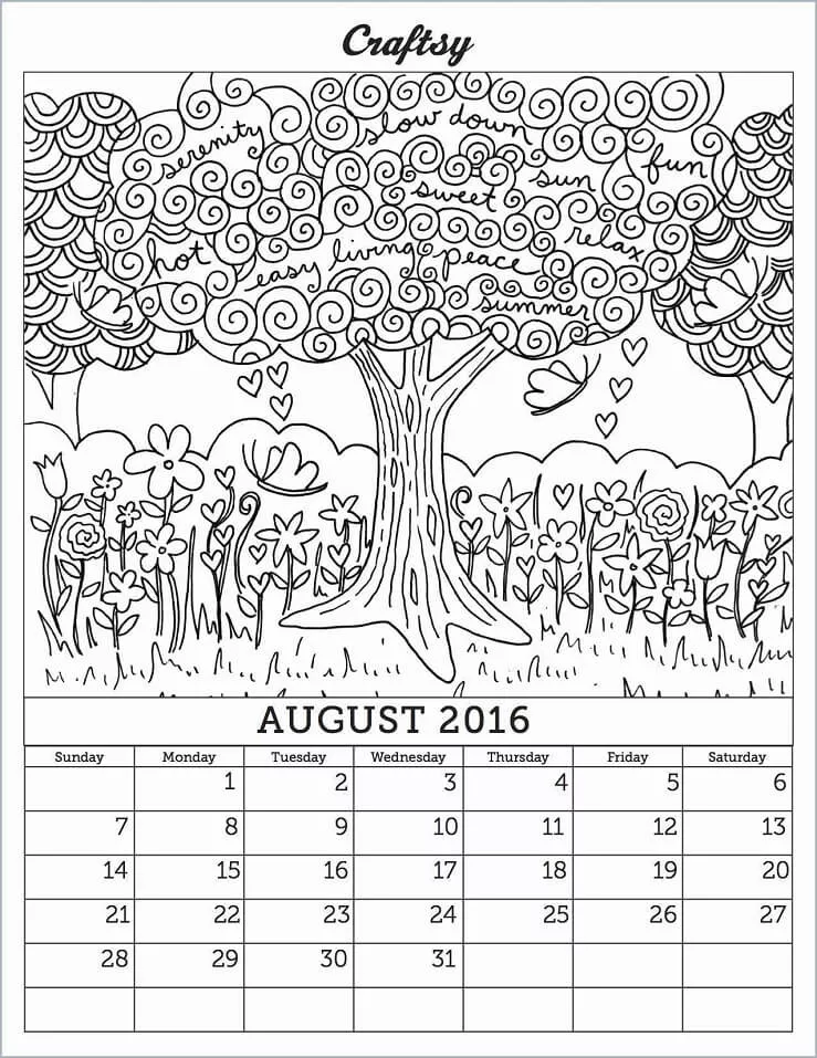 Coloring description : Download Printable 2016 Calendar August Coloring Page