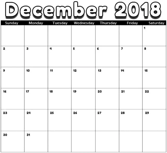 Coloring description : Download Printable December 2018 Calendar Coloring Page
