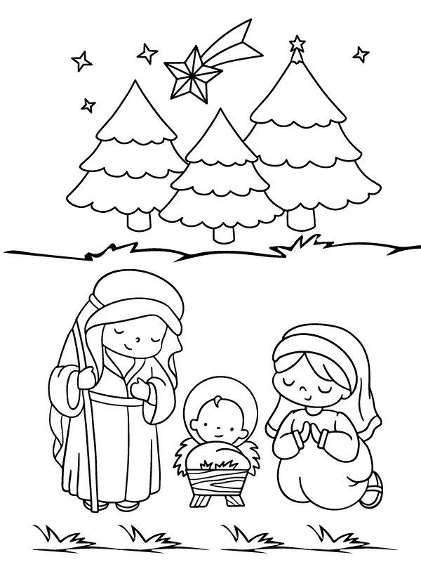 Coloring description : Download Printable Nativity Scene and Christmas tree Coloring Page