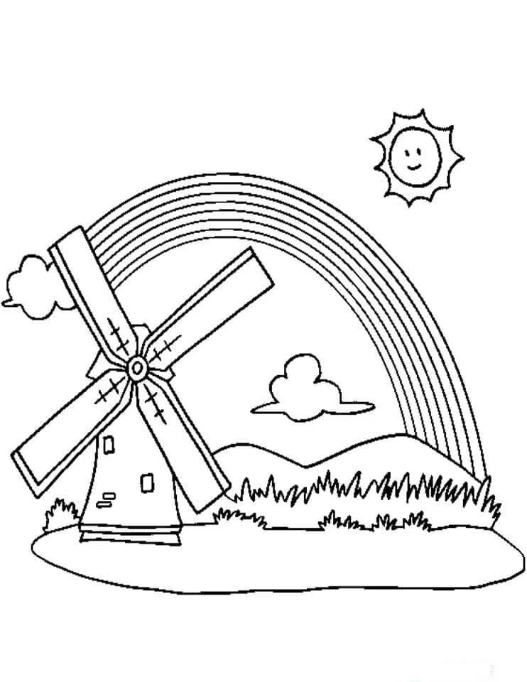 Coloring description : Download Printable Windmill and Rainbow Coloring Page