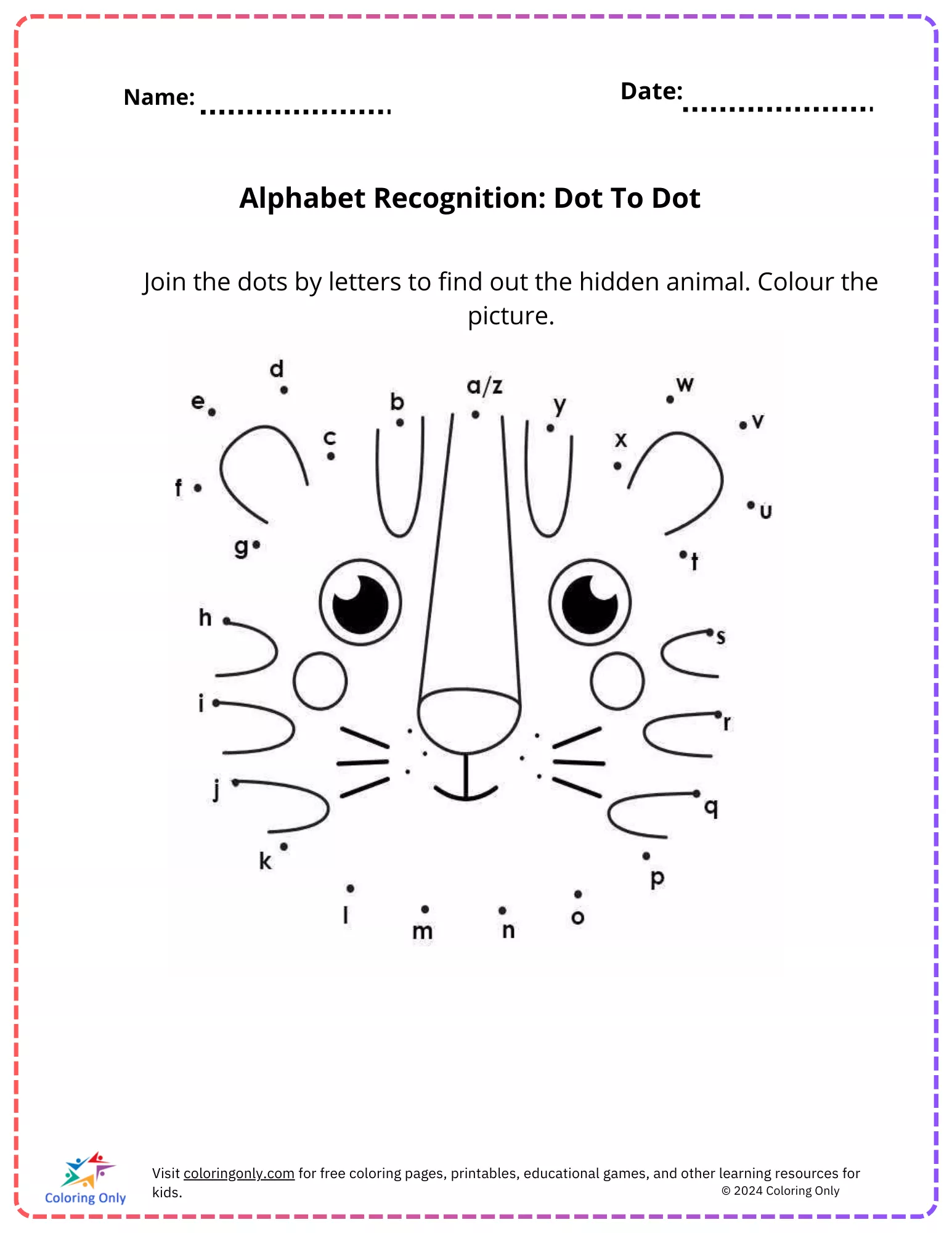 The "Alphabet Recognition: Dot To Dot Free Printable Worksheet" is a fun and educational activity that helps elementary students improve their letter recognition skills while revealing a hidden animal image. By joining the dots in alphabetical order, children not only practice the sequence of letters but also enhance their fine motor skills and concentration. This "Alphabet Recognition: Dot To Dot Free Printable Worksheet" is perfect for classroom or home use, making learning an enjoyable experience for young learners. Once the dots are connected, students can color the picture, adding a creative touch to their learning process.