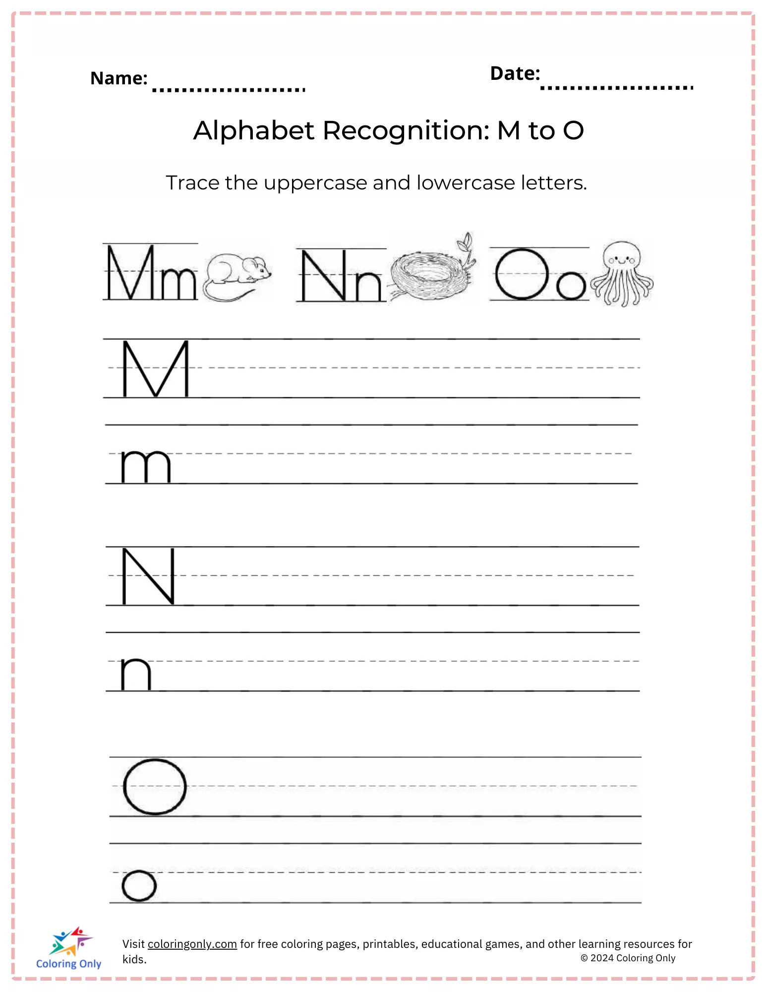 Alphabet Recognition: M to O Free Printable Worksheet