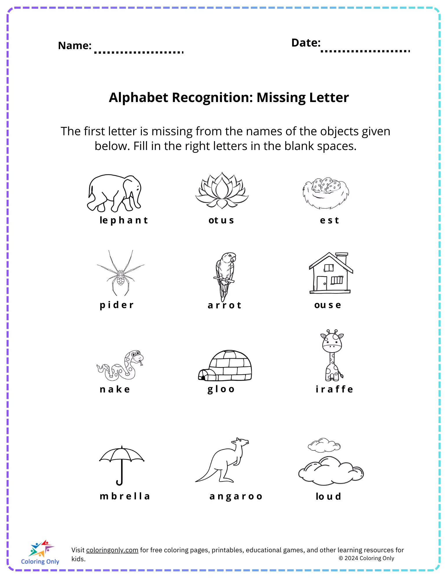 The "Alphabet Recognition: Missing Letter Free Printable Worksheet" is an engaging activity designed to help elementary students strengthen their letter recognition and spelling skills. In this worksheet, the first letter is missing from the names of various objects, and students are asked to fill in the correct missing letters. This "Alphabet Recognition: Missing Letter Free Printable Worksheet" is perfect for building confidence in early readers, improving their vocabulary, and making learning fun through visual aids. It's a great resource for both classroom and at-home practice.