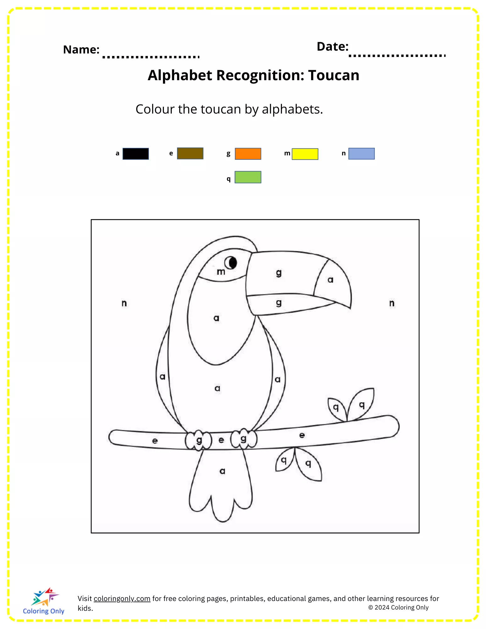 The "Alphabet Recognition: Toucan Free Printable Worksheet" is a fun and educational activity designed for elementary students. This worksheet helps children practice their alphabet recognition skills by coloring a picture of a toucan according to the letters provided. Each section of the toucan is labeled with a letter, and students must use the key to match the letters with the correct colors. This "Alphabet Recognition: Toucan Free Printable Worksheet" is perfect for reinforcing letter recognition, improving fine motor skills, and making learning enjoyable.