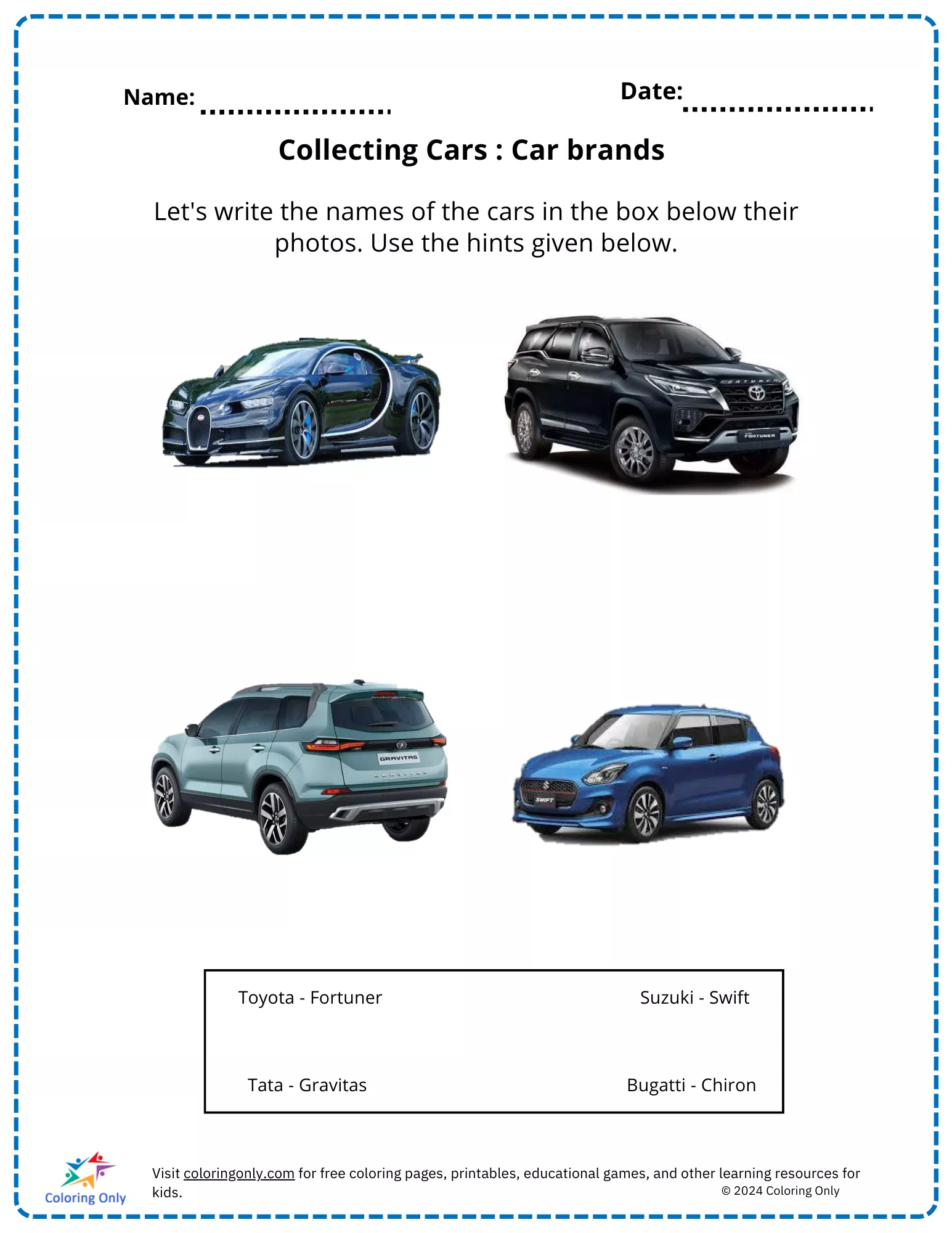 The "Collecting Cars: Car Brands Free Printable Worksheet" is a fun and educational activity designed for elementary students who love cars. This worksheet challenges children to identify and match the names of popular car brands with their corresponding images. Featuring well-known models like the Bugatti Chiron, Toyota Fortuner, Tata Gravitas, and Suzuki Swift, this "Collecting Cars: Car Brands Free Printable Worksheet" helps students enhance their observation and matching skills while learning more about automotive brands. It's a perfect blend of learning and entertainment for young car enthusiasts.