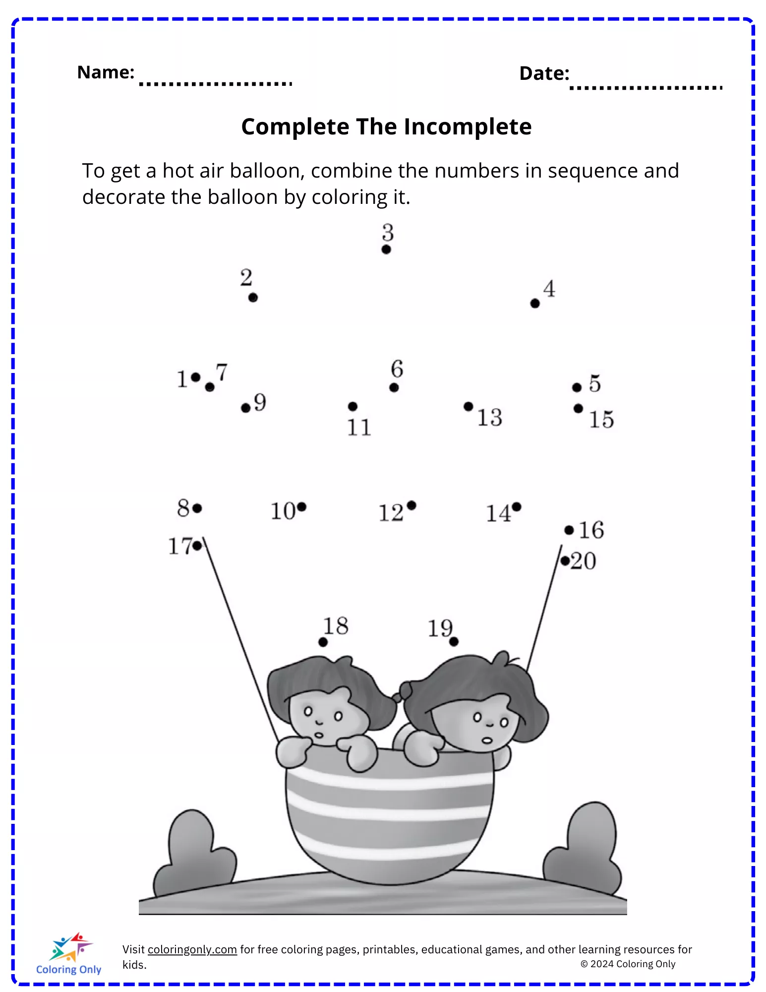 The Complete The Incomplete Free Printable Worksheet is a fun and interactive activity designed for elementary students. This worksheet encourages children to connect the dots in numerical order to reveal a hot air balloon. Once completed, students can color and decorate the balloon, enhancing their creativity and fine motor skills. The Complete The Incomplete Free Printable Worksheet is perfect for helping kids practice number sequencing while having fun with coloring. Ideal for both classroom and at-home learning, this activity is sure to keep young learners engaged and entertained.
