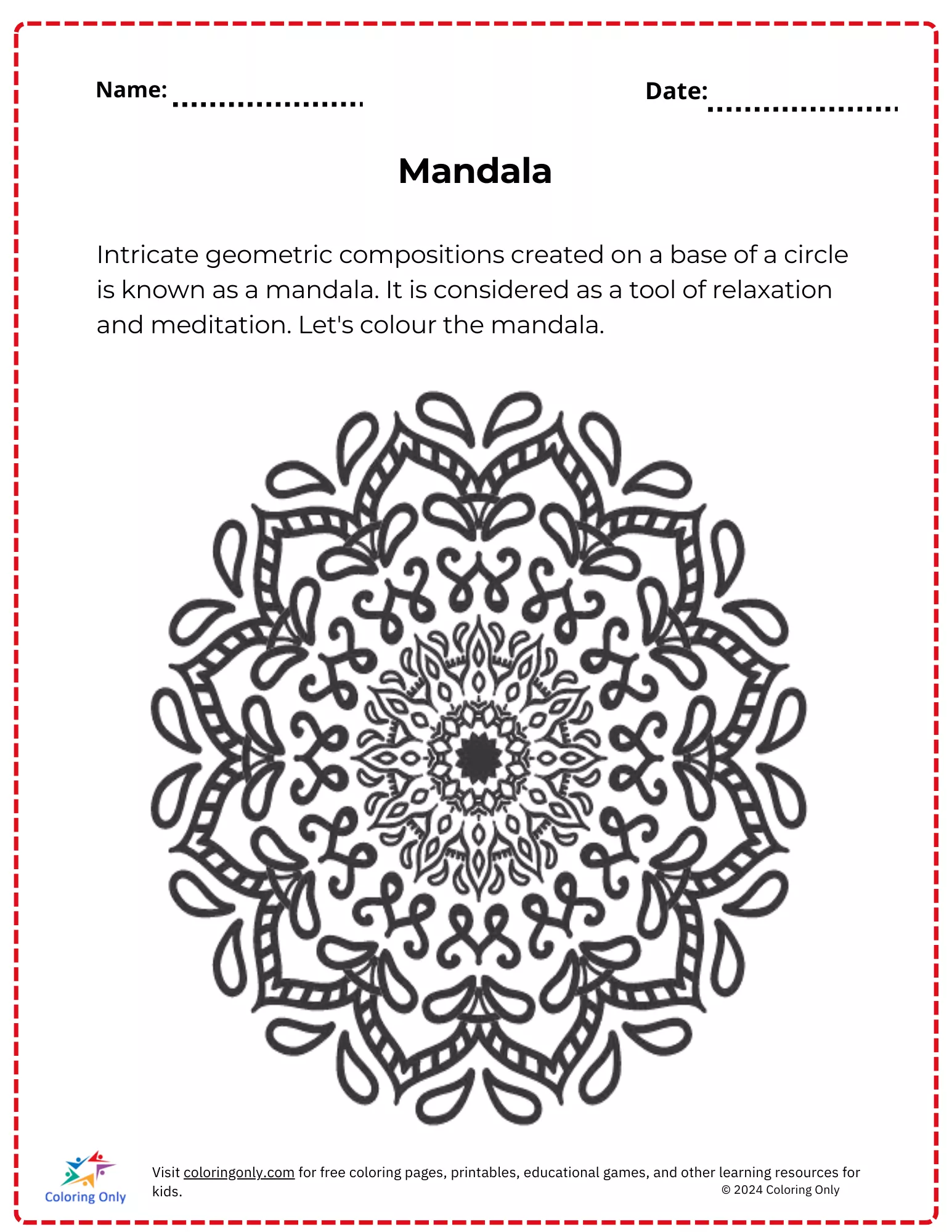 This Mandala Free Printable Worksheet is designed to help elementary students engage in a relaxing and creative activity. Mandalas, intricate geometric patterns within a circle, are known for their calming effects and are often used for meditation and mindfulness. This worksheet encourages children to color the mandala, fostering creativity and concentration while providing a soothing outlet for self-expression. Ideal for classroom or at-home activities, the Mandala Free Printable Worksheet offers a fun and peaceful way to introduce young learners to the therapeutic art of mandala designs.