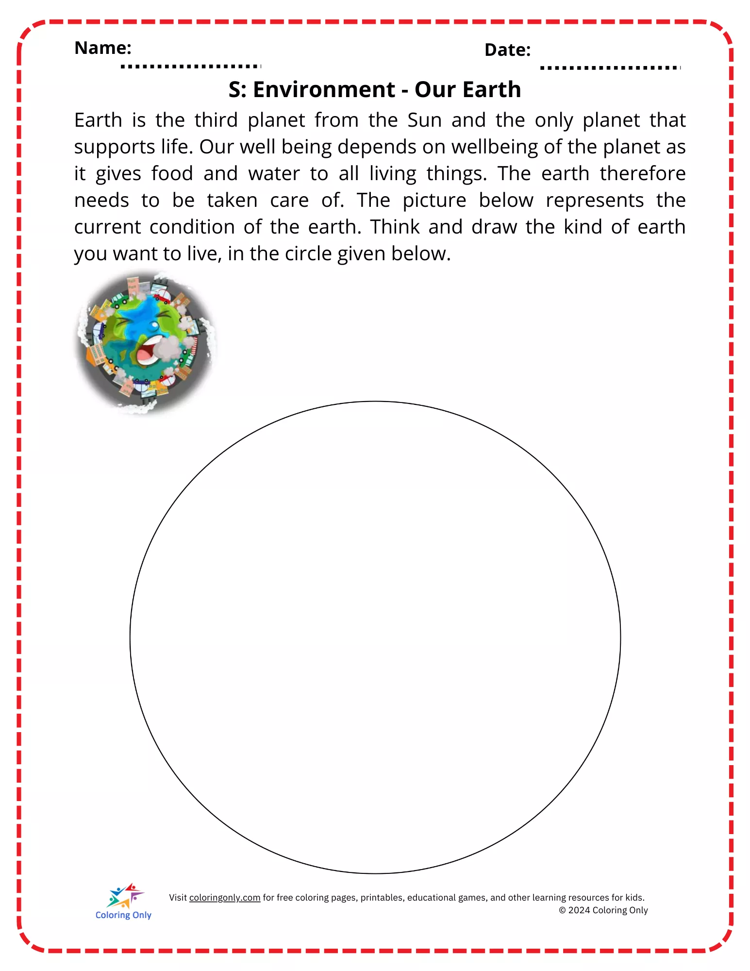 The S: Environment - Our Earth Free Printable Worksheet is a creative activity designed to help elementary students understand the importance of protecting our planet. This worksheet provides an engaging way for kids to reflect on Earth's current condition and envision a healthier environment by drawing their ideal world inside the provided circle. Through the S: Environment - Our Earth Free Printable Worksheet, children develop awareness about sustainability, pollution, and conservation while expressing their creativity. Perfect for classrooms, homeschool lessons, or environmental education activities, this worksheet encourages young learners to think about their role in caring for the planet.