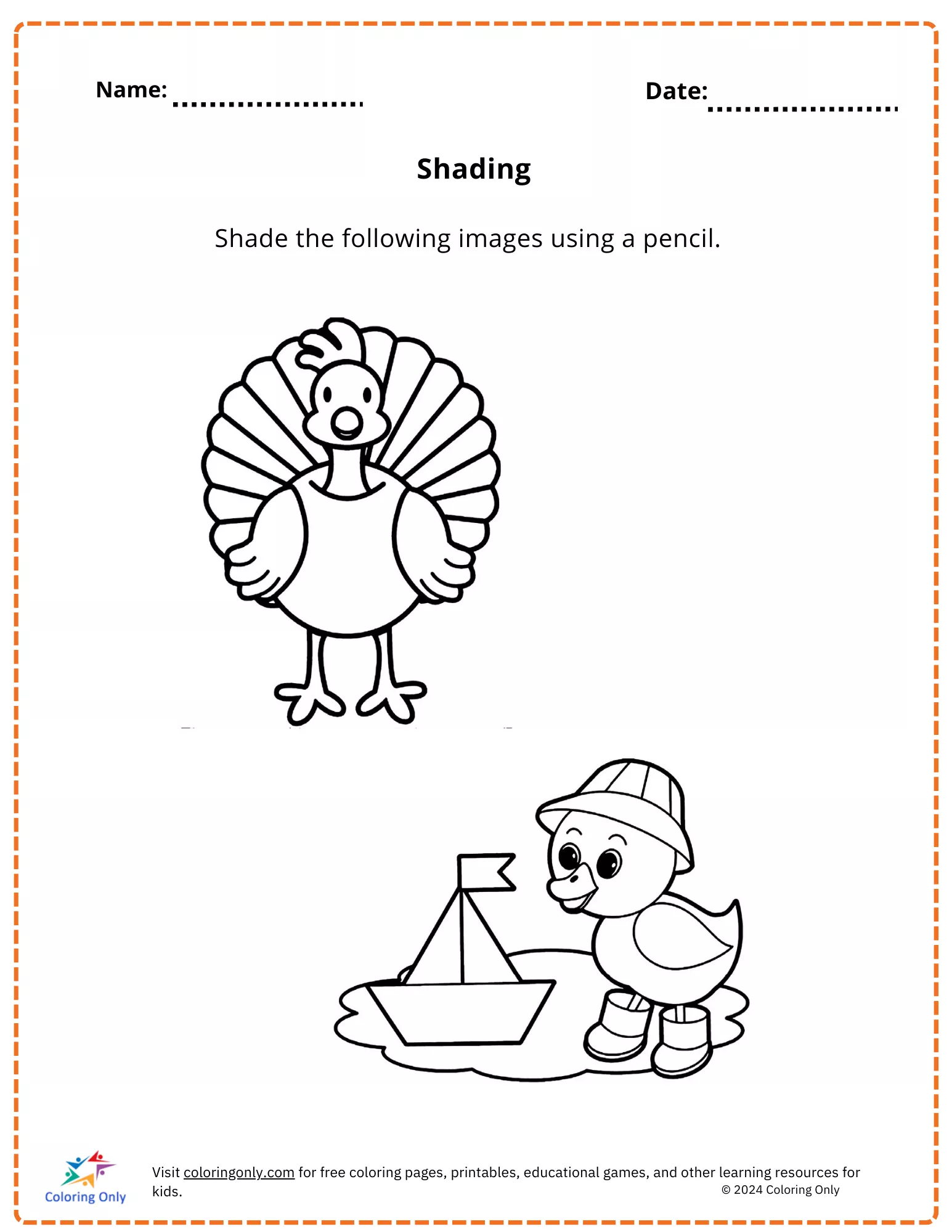 This Shading Free Printable Worksheet offers elementary students an opportunity to practice their pencil shading skills. The worksheet features two fun and engaging images—a turkey and a duck with a sailboat—designed for students to shade and bring to life with their artistic touch. This activity encourages creativity, improves fine motor skills, and enhances focus. Ideal for classroom activities or at-home learning, the Shading Free Printable Worksheet provides a simple yet effective way to introduce young learners to shading techniques and develop their artistic abilities.