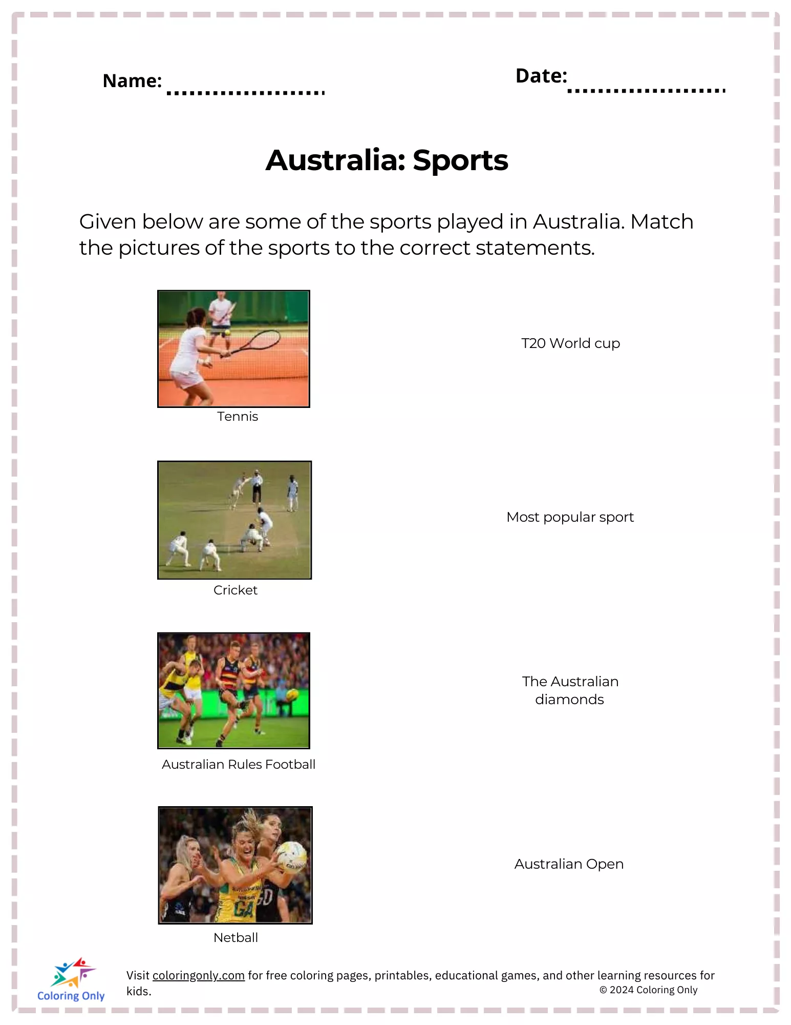 Introduce your students to popular sports in Australia with our "Australia: Sports Free Printable Worksheet." This engaging worksheet features images of sports played in Australia, including tennis, cricket, Australian Rules Football, and netball. Students are tasked with matching the pictures to the correct statements, such as "T20 World Cup," "Most popular sport," "The Australian Diamonds," and "Australian Open." This activity helps students learn about different sports and their significance in Australian culture. Ideal for elementary students, the "Australia: Sports Free Printable Worksheet" combines fun with educational value, enhancing their knowledge of global sports.