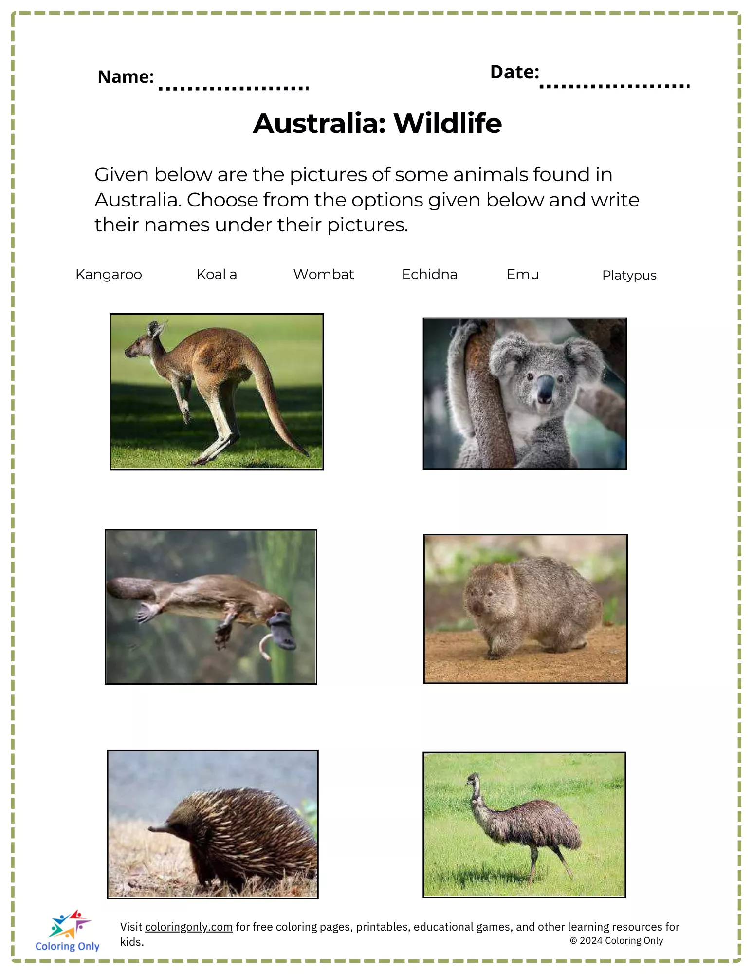 Explore the fascinating animals of Australia with our "Australia: Wildlife Free Printable Worksheet." This educational worksheet features images of six unique Australian animals: kangaroo, koala, wombat, echidna, emu, and platypus. Students are tasked with identifying each animal and writing their names below the corresponding pictures using the provided options. This engaging activity helps students learn about Australian wildlife while practicing their observation and writing skills. Perfect for elementary students, the "Australia: Wildlife Free Printable Worksheet" is an excellent resource for geography and science lessons.