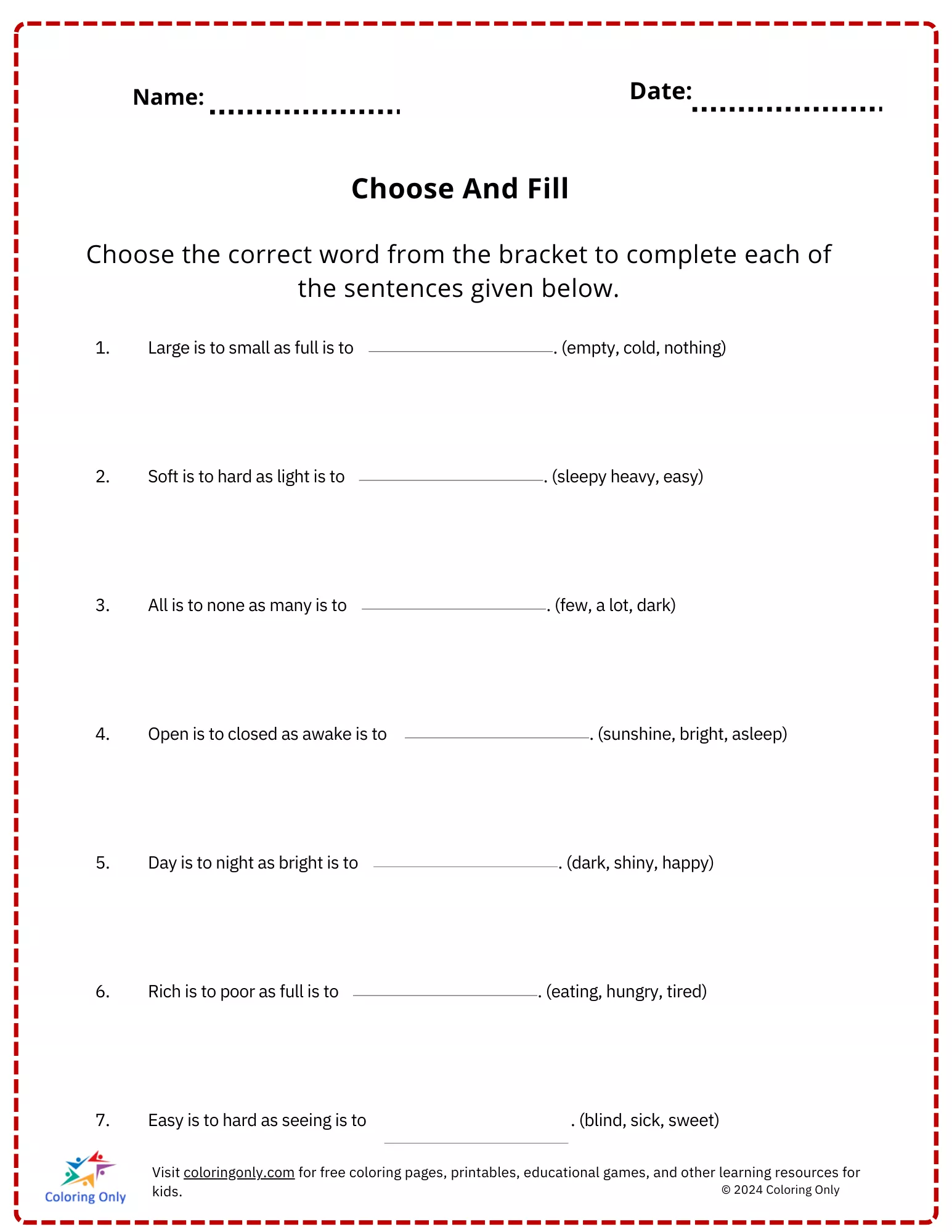The "Choose And Fill Free Printable Worksheet" is a fun and interactive activity designed for elementary students. This worksheet helps children enhance their vocabulary and critical thinking by encouraging them to choose the correct word from a given set of options to complete sentences. With simple comparisons and analogies, the "Choose And Fill Free Printable Worksheet" enables kids to better understand word relationships and develop language skills. Ideal for classroom or home learning, this worksheet engages students in a creative way to reinforce word associations and sentence structure.