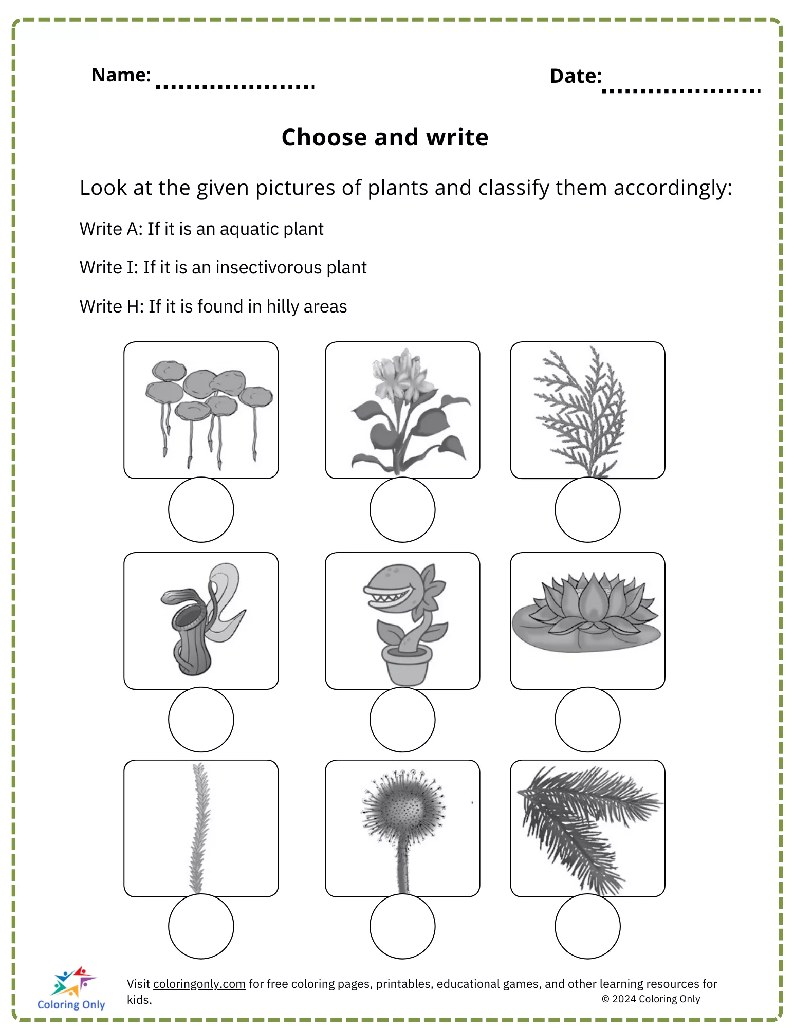 The Choose and Write free Printable Worksheet is a fun and engaging activity for elementary students to classify plants based on their characteristics. In this worksheet, students will analyze the images of different plants and write “A” for aquatic plants, “I” for insectivorous plants, and “H” for plants found in hilly areas. This activity promotes observational skills and helps students learn about plant habitats and types. The Choose and Write Printable Worksheet is a perfect addition to science lessons and nature study units for young learners.
