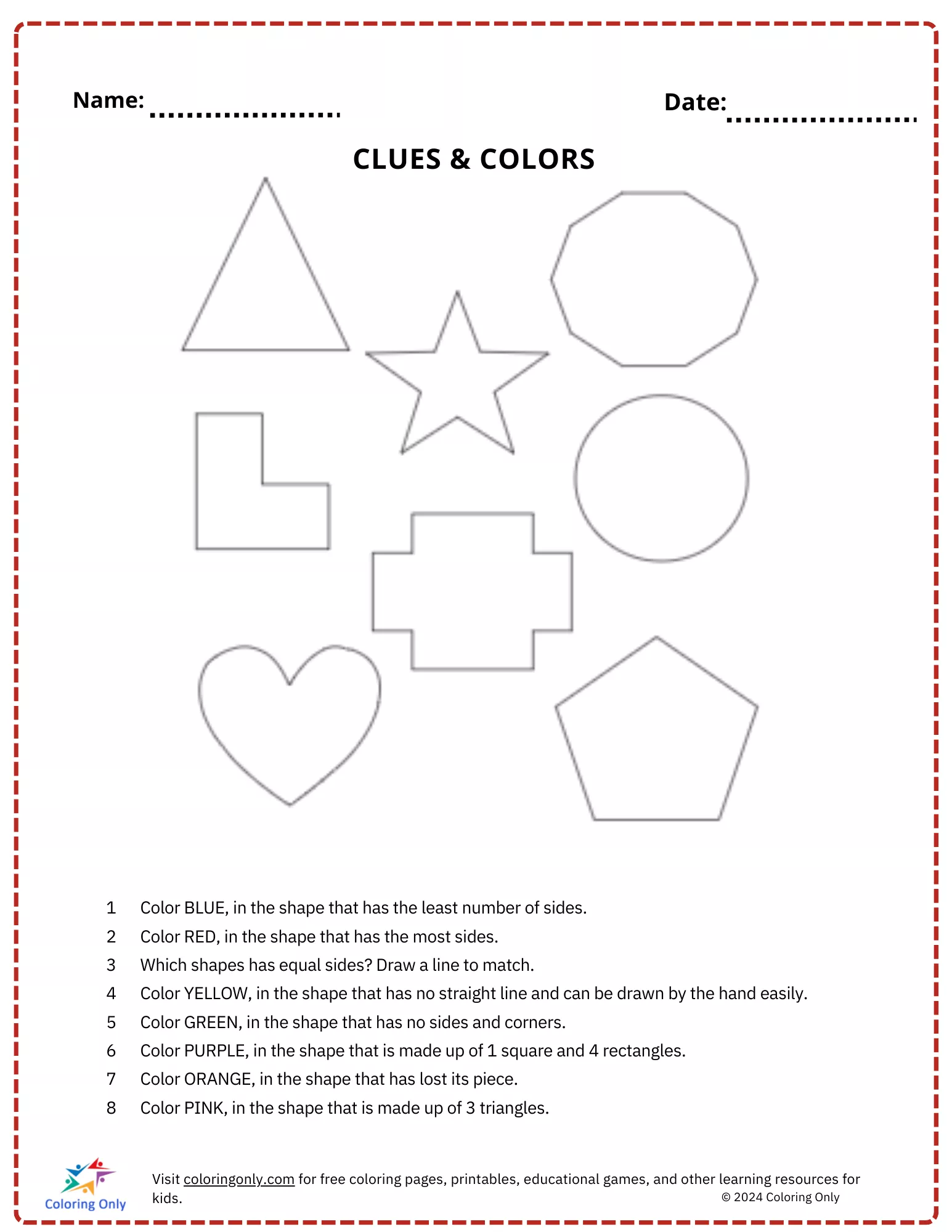 The "CLUES & COLORS free Printable Worksheet" is an engaging activity designed for elementary students to practice shape recognition, color matching, and logical reasoning. This worksheet provides a set of clues to help students identify each shape and color it accordingly. For example, students will color the shape with the fewest sides in blue, identify the shape with the most sides for red, and find shapes with equal sides to connect with lines. This "CLUES & COLORS free Printable Worksheet" encourages critical thinking as children use hints to distinguish shapes and enhance their understanding of geometry. Perfect for classroom exercises or at-home learning, this worksheet makes learning fun and colorful.