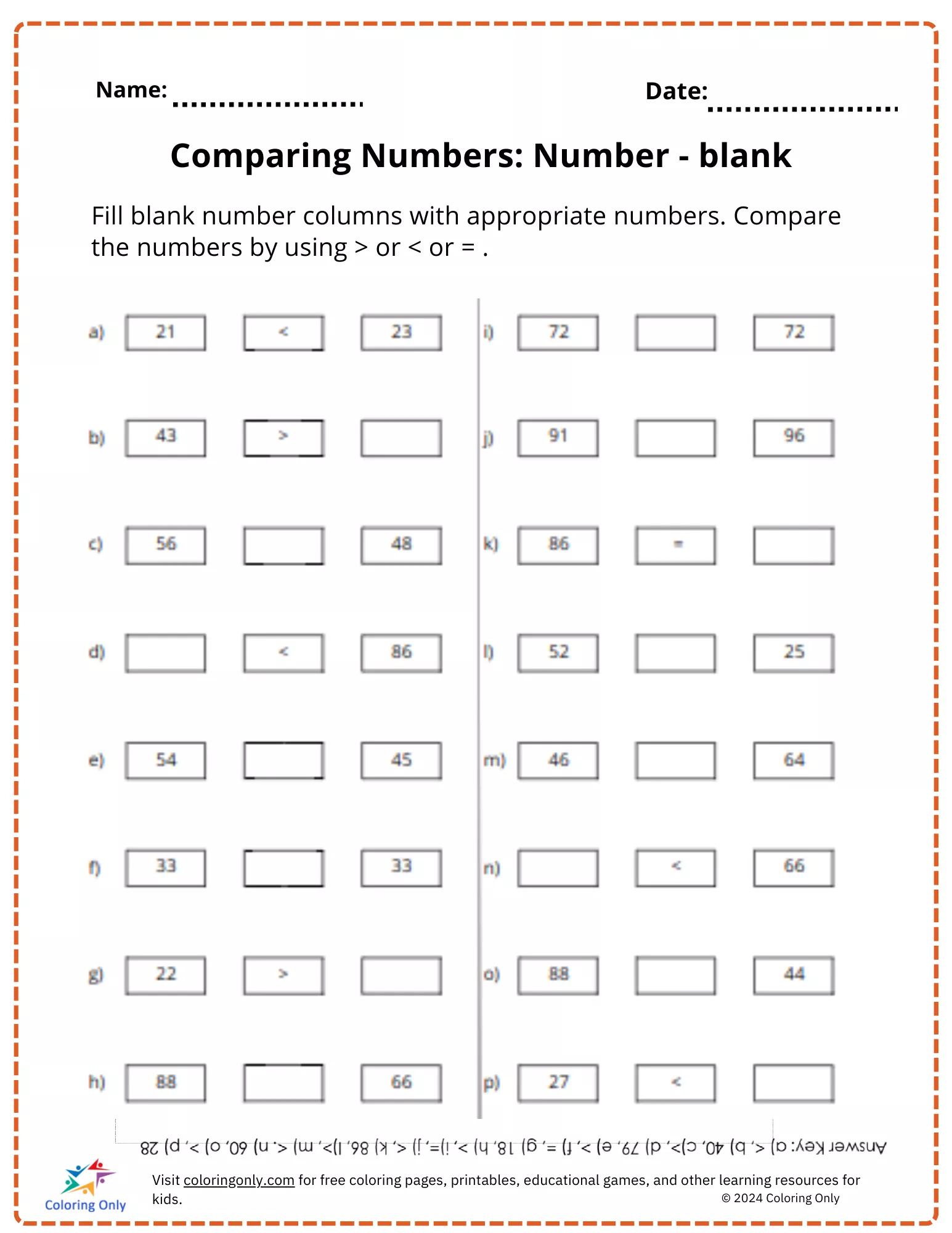 The Comparing Numbers: Number - Blank Free Printable Worksheet is designed to help elementary students practice comparing numbers by filling in blanks with appropriate values. Learners will place numbers in the empty boxes and compare them using symbols like greater than (>), less than (<), or equal to (=). This activity reinforces numerical understanding and comparison skills while encouraging critical thinking. Ideal for use in classrooms or at home, this Comparing Numbers: Number - Blank Free Printable Worksheet offers an engaging way to boost math proficiency.