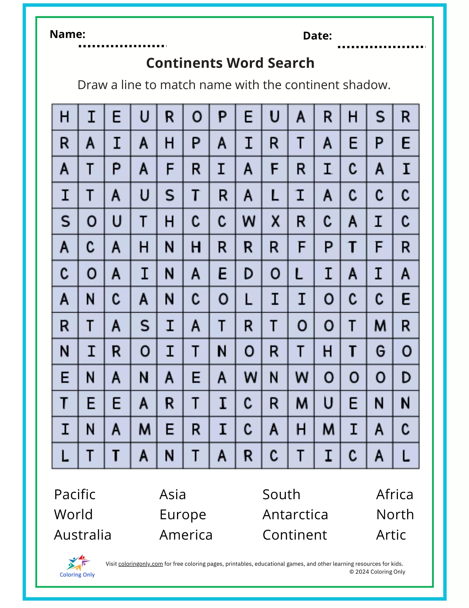 The Continents Word Search Free Printable Worksheet is a fun and educational activity for elementary students to improve their geography knowledge and vocabulary skills. This worksheet includes a word search puzzle featuring continents such as Asia, Europe, Africa, and Antarctica, along with related terms like "world" and "ocean." Students can search for words horizontally, vertically, or diagonally, making it a great way to develop problem-solving skills while learning. Ideal for classroom use, homeschooling, or as a supplemental activity, the Continents Word Search Free Printable Worksheet engages kids in an entertaining way to reinforce geography concepts.