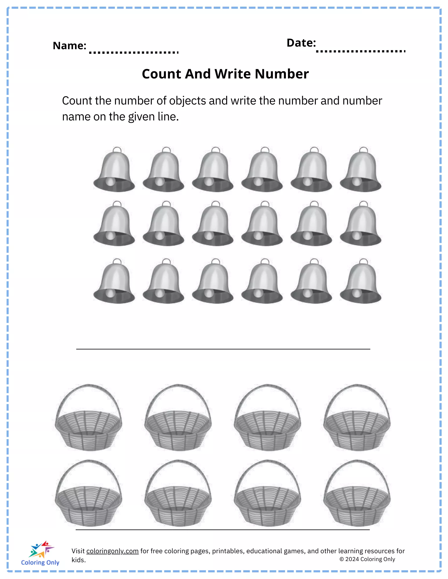 Help your elementary students practice their counting and writing skills with our "Count And Write Number Free Printable Worksheet." This engaging worksheet features two sets of objects—bells and baskets. Children are tasked with counting the number of each object and then writing the corresponding number and its name on the provided lines. The "Count And Write Number Free Printable Worksheet" supports the development of number recognition, counting proficiency, and writing skills in a fun and interactive way. Perfect for both home and classroom use, this worksheet offers an enjoyable and educational activity for young learners. Download and print this free resource to enhance your child's counting and writing abilities