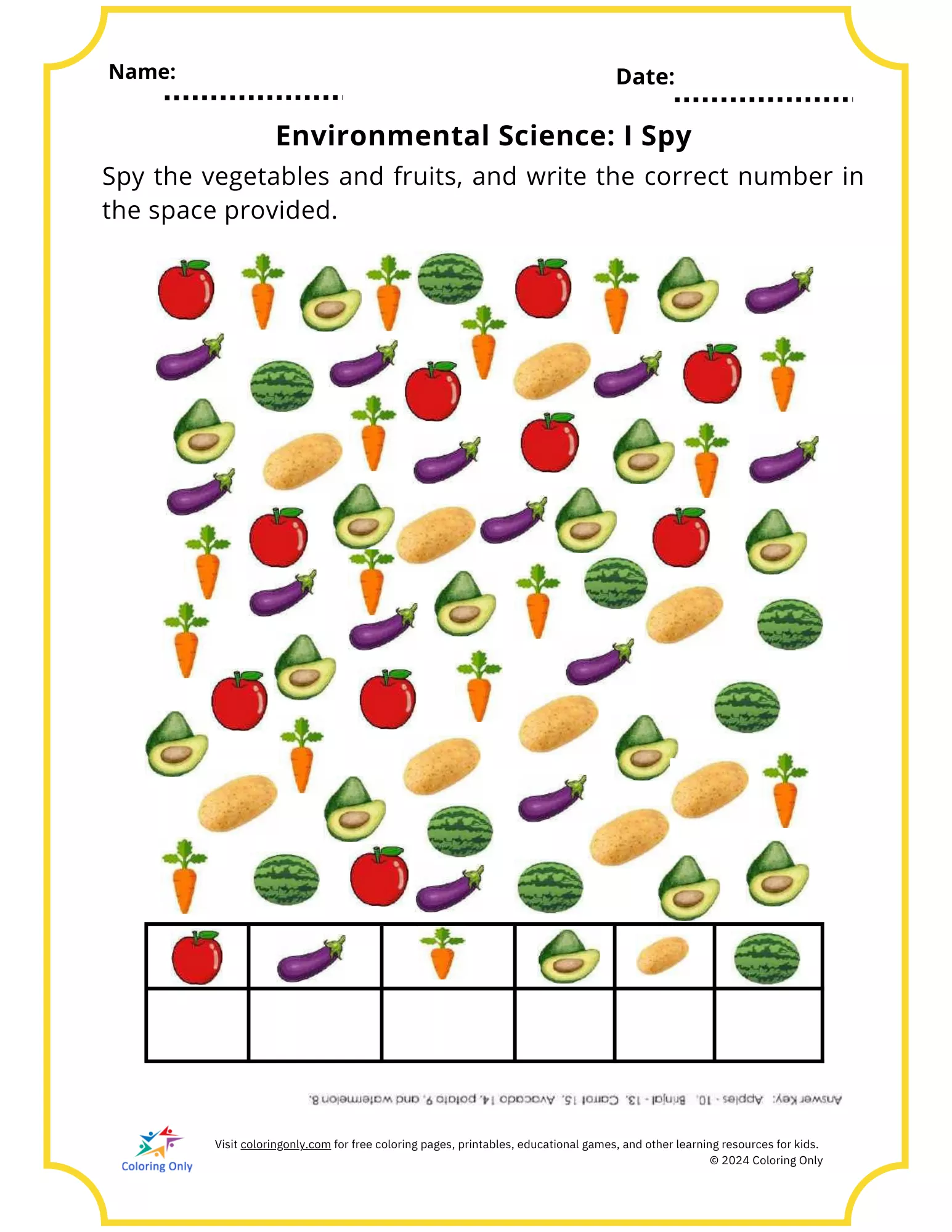 The Environmental Science: I Spy Free Printable Worksheet is a fun and interactive activity designed to teach elementary students about fruits and vegetables. This worksheet encourages children to identify and count various fruits and vegetables from a colorful array of images, helping them develop observation, counting, and categorization skills. Perfect for introducing kids to healthy eating habits and environmental awareness, the Environmental Science: I Spy Free Printable Worksheet is an engaging tool for both classroom lessons and at-home learning. Enhance your child’s knowledge while they enjoy this playful and educational exercise.
