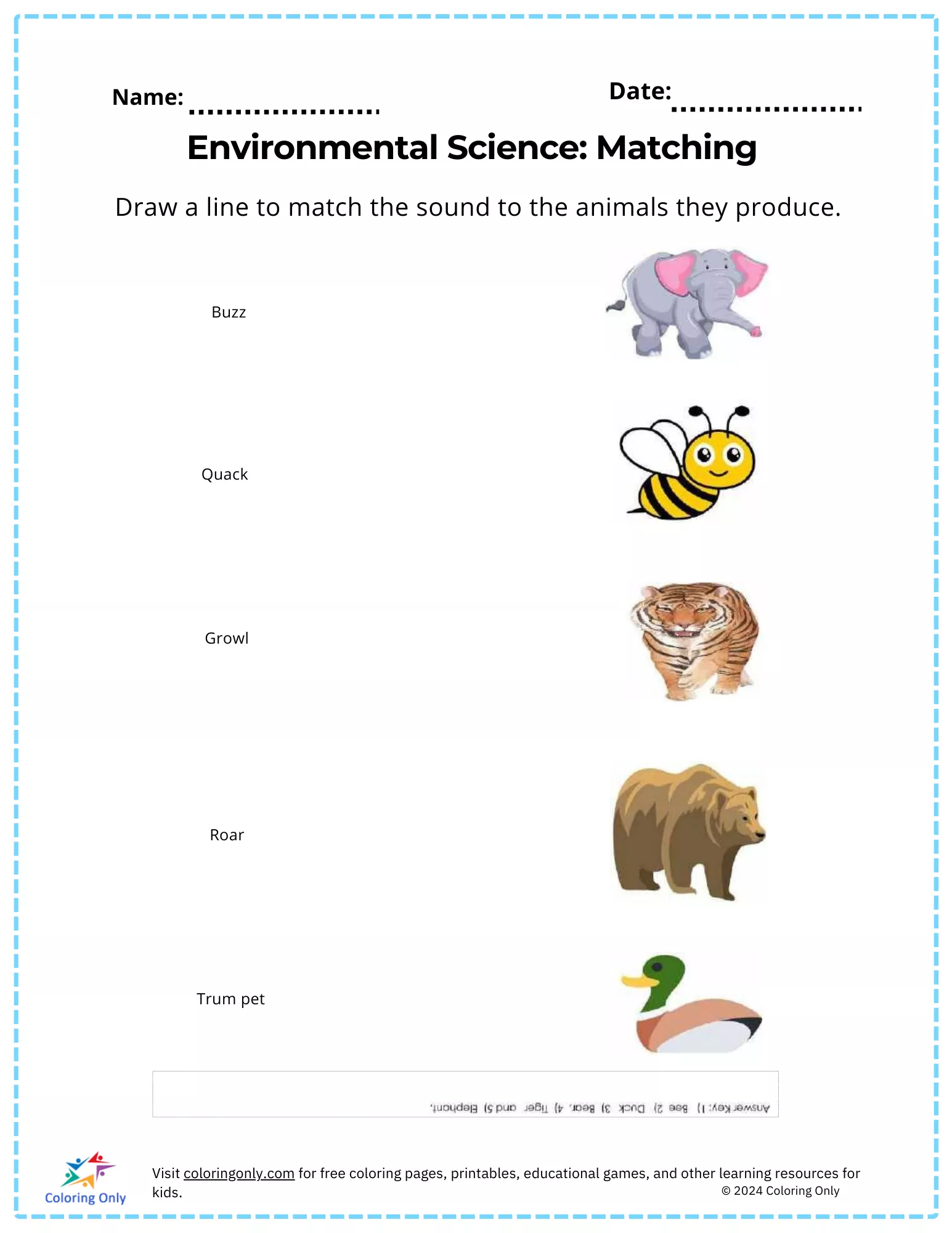 Help your child learn about animal sounds with our "Environmental Science: Matching Free Printable Worksheet"! This engaging worksheet is designed for elementary students to practice matching animals with the sounds they produce. The "Environmental Science: Matching Free Printable Worksheet" features images of various animals, such as an elephant, bee, tiger, bear, and duck, along with corresponding sounds like buzz, quack, growl, roar, and trumpet. Students are encouraged to draw lines connecting each animal to its sound, enhancing their understanding of animal behavior and improving their observational skills. Ideal for both classroom activities and at-home practice, this worksheet offers a fun and educational way to reinforce your child's knowledge of animals and their sounds. Download your copy today and support your child's learning journey