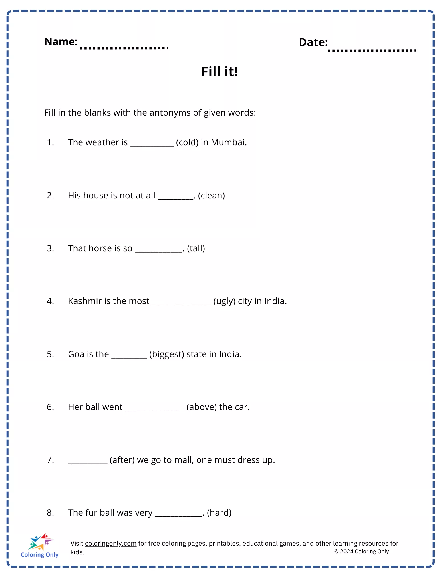 The Fill it! Free Printable Worksheet is an engaging and interactive activity designed for elementary students to practice their understanding of antonyms. This worksheet challenges students to fill in the blanks by providing opposite words (antonyms) to the words given in each sentence. Perfect for developing vocabulary, comprehension, and grammar skills, the Fill it! Free Printable Worksheet offers a fun way to enhance language abilities. Whether used in a classroom or at home, this activity encourages critical thinking and reinforces the concept of opposites.