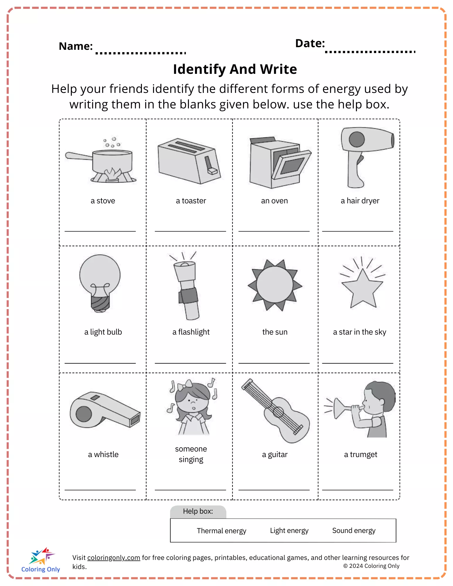The "Identify And Write Free Printable Worksheet" is a fantastic educational resource for elementary students. This worksheet helps students identify different forms of energy, such as thermal, light, and sound energy, associated with everyday objects like a stove, flashlight, or guitar. By using the help box, students will write the correct type of energy in the blanks provided under each image. The "Identify And Write Free Printable Worksheet" not only reinforces science concepts but also engages students in a fun and interactive way, making learning more enjoyable.