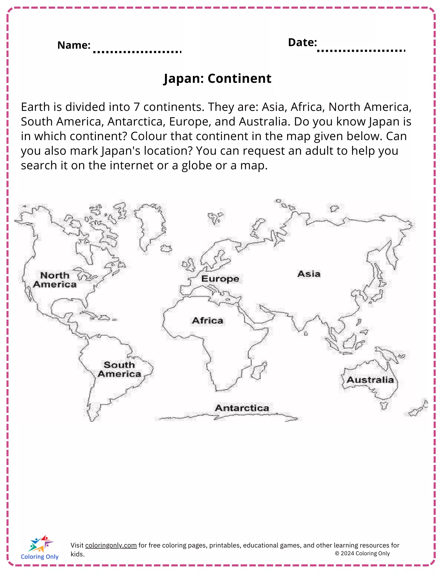 The "Japan: Continent Free Printable Worksheet" is an engaging educational tool designed for elementary students to learn about the seven continents. This worksheet provides a world map where students are asked to identify and color the continent where Japan is located—Asia. It also encourages students to mark Japan's exact location on the map, enhancing their geographical knowledge. The "Japan: Continent Free Printable Worksheet" is a fun way to introduce young learners to world geography, helping them understand the placement of continents and countries. It's a great resource for combining art, critical thinking, and global awareness in one activity.