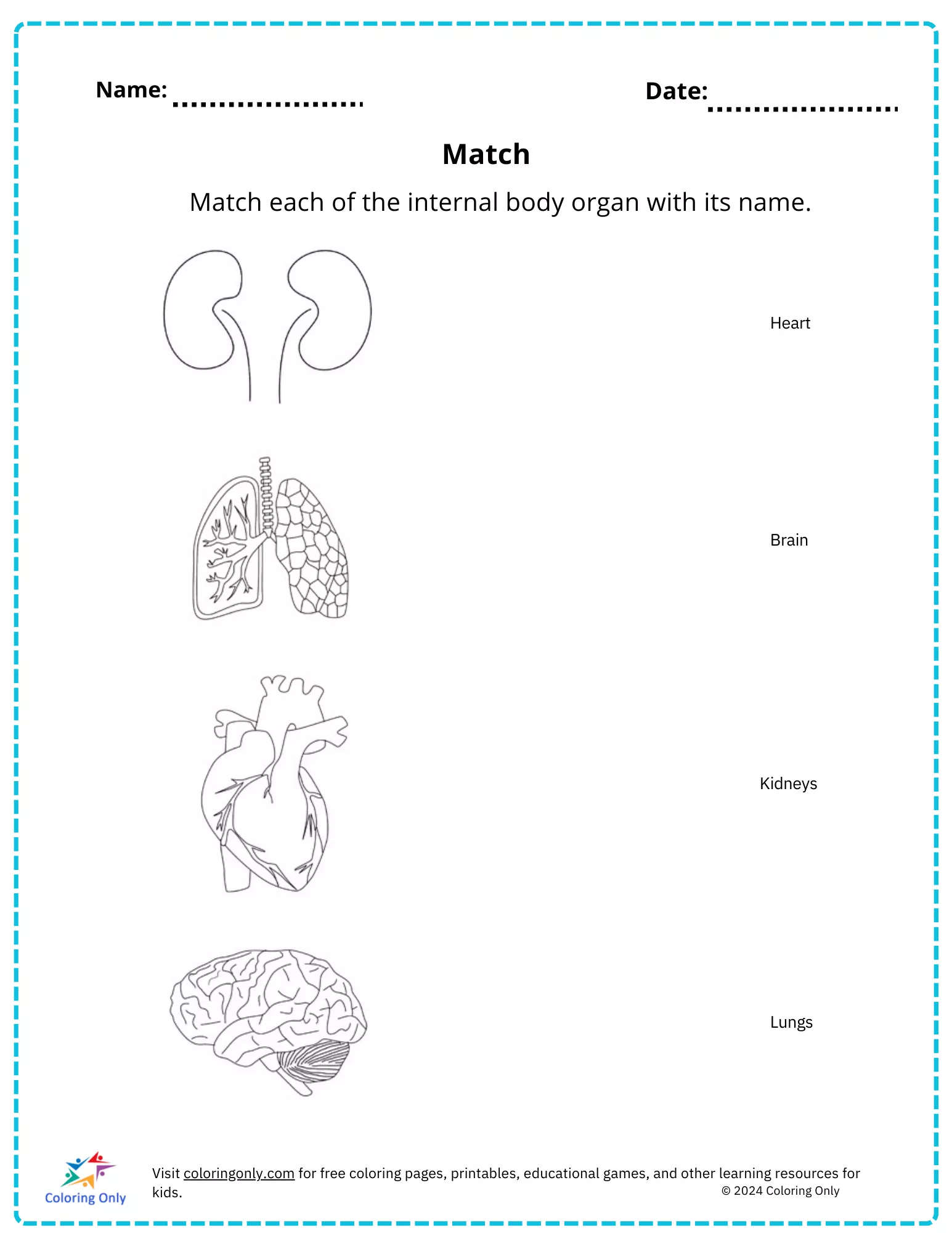 The Match Free Printable Worksheet is an educational activity designed to help elementary students learn about internal body organs. This worksheet features images of key organs such as the heart, brain, lungs, and kidneys, and tasks students with matching each organ to its correct name. It encourages recognition of basic anatomy while enhancing problem-solving and matching skills. Ideal for classroom use or at-home learning, the Match Free Printable Worksheet provides a fun and interactive way for young learners to understand the human body's structure.