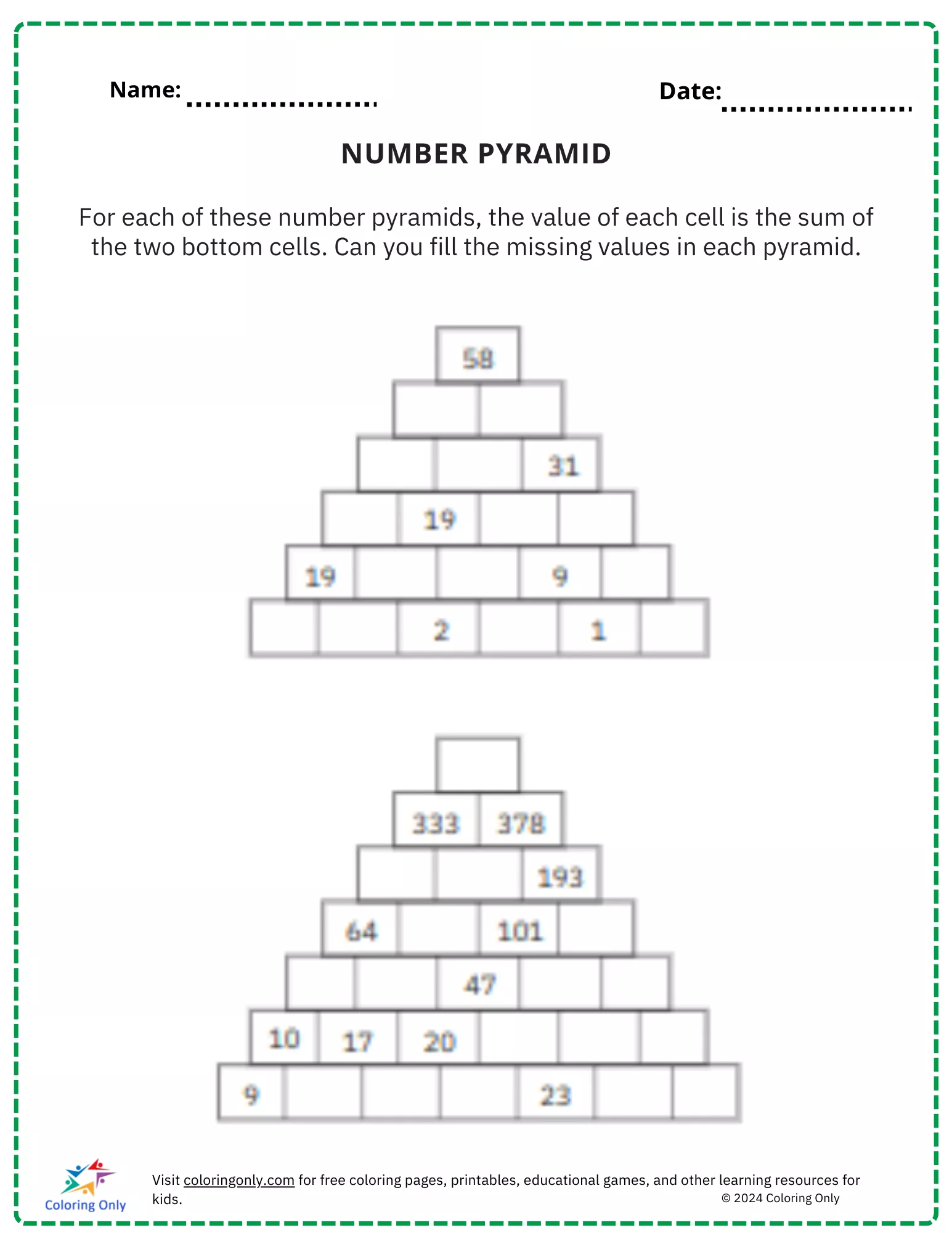 This NUMBER PYRAMID free Printable Worksheet is a fantastic way for elementary students to practice addition and enhance their math skills. By solving the number pyramid, where each cell is the sum of the two cells directly beneath it, students will reinforce their understanding of addition concepts. This worksheet provides a fun and interactive way for children to improve problem-solving and critical thinking. Ideal for both classroom use and at-home practice, this activity will engage young learners while boosting their math confidence.
