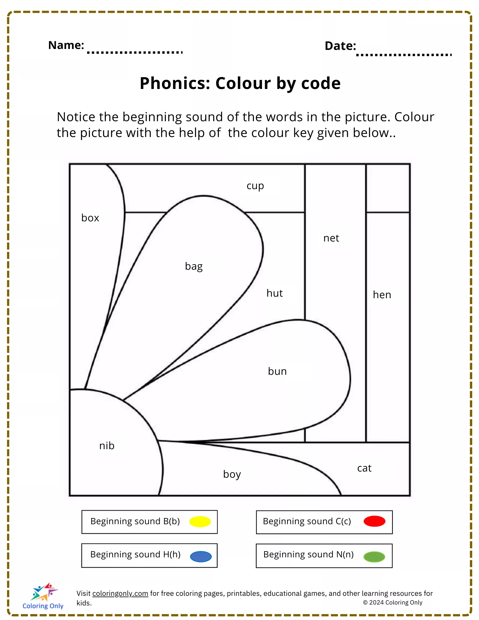 The Phonics: Colour by Code Free Printable Worksheet is a creative and educational tool for preschoolers to enhance their phonics and letter recognition skills. By identifying the beginning sounds of simple words like "box," "cup," and "net," children will use the color key to color each section of the picture. This hands-on activity helps young learners reinforce their understanding of letter sounds while having fun with colors. The Phonics: Colour by Code Free Printable Worksheet is ideal for early learners at home or in the classroom.