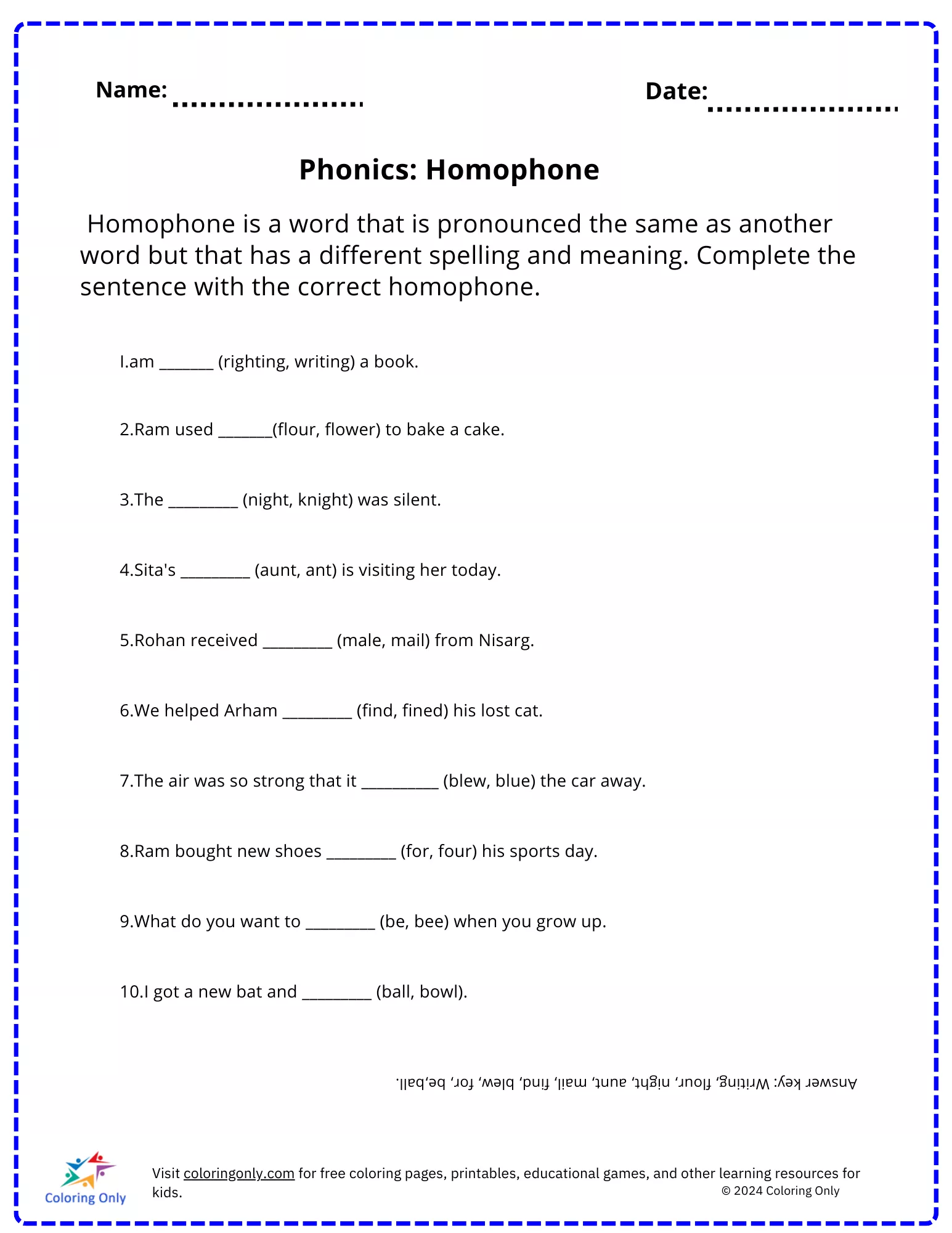 The Phonics: Homophones Free Printable Worksheet is designed to help elementary students understand the concept of homophones—words that sound the same but have different spellings and meanings. This engaging worksheet encourages students to complete sentences by choosing the correct homophone from a pair, enhancing their vocabulary and language skills. It’s a perfect activity to reinforce spelling, pronunciation, and grammar lessons while providing fun practice in using homophones correctly in context. This Phonics: Homophones Free Printable Worksheet is an excellent resource for teachers and parents to support language development in young learners.