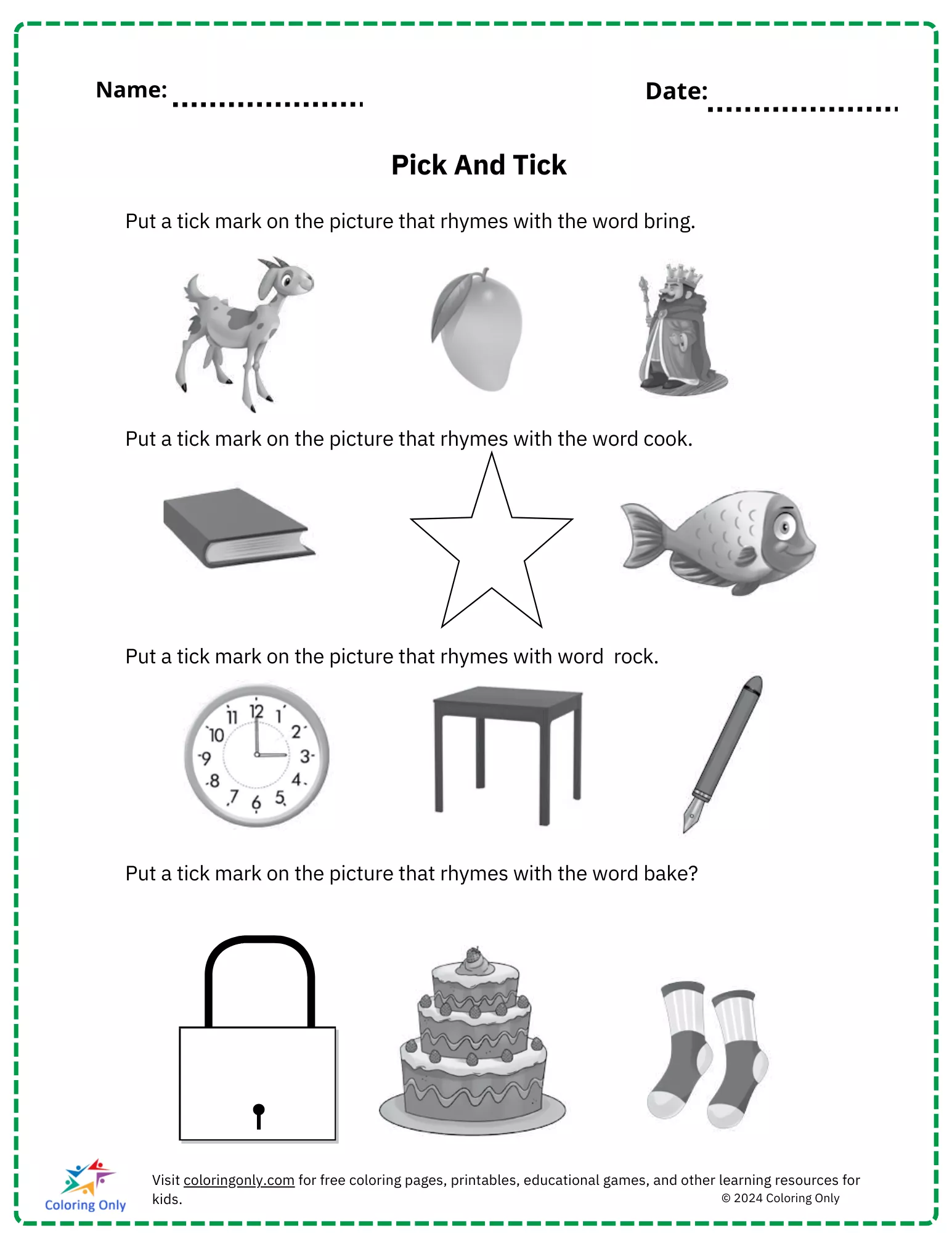 The Pick And Tick words Free Printable Worksheet is a fun and interactive activity designed for elementary students. This worksheet helps children enhance their rhyming skills by selecting the picture that rhymes with the given word. With clear instructions and engaging images, this Pick And Tick words Free Printable Worksheet promotes phonetic awareness and builds vocabulary through simple word associations. It’s a great resource for early learners to practice and improve their understanding of word sounds and rhyme patterns.
