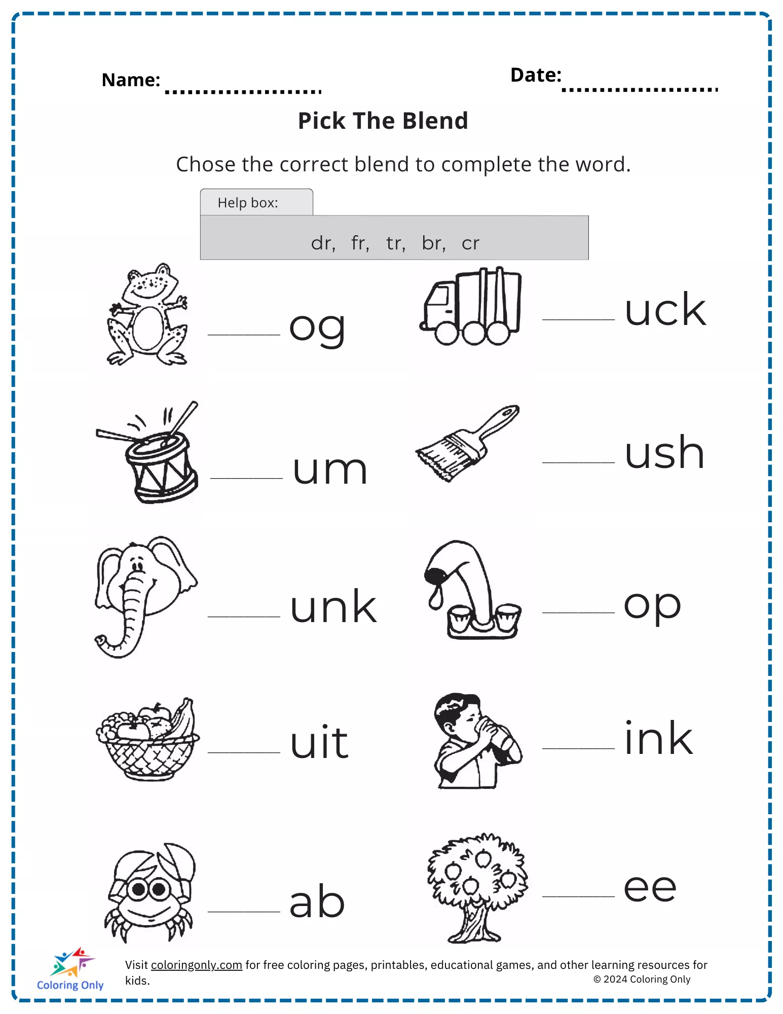 The "Pick The Blend Free Printable Worksheet" is an engaging activity designed to help elementary students practice their blending skills. This worksheet encourages students to choose the correct blend (dr, fr, tr, br, cr) to complete each word associated with a fun and familiar image. It’s a fantastic resource for reinforcing phonics, improving spelling, and building confidence in word recognition. The "Pick The Blend Free Printable Worksheet" offers a playful yet educational experience, perfect for classroom use or home learning sessions.